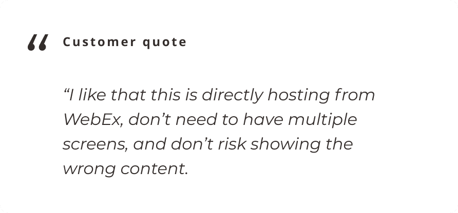 Sellers can share content directly from the WebEx meeting app, making it easier than ever to present without switching context. Even better, part of the screen stays hidden from the audience—unlocking new opportunities to enhance the presentation experience.